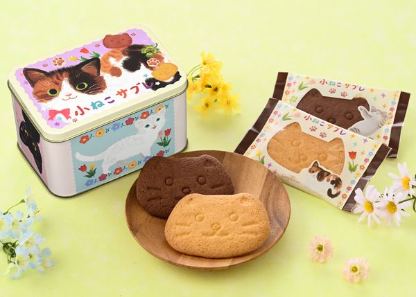 サックリとした食感とお口の中でほろほろと溶けていく素朴な風味が魅力の、バター&ココア味の小ねこ形サブレ。かわいいポーズをとる白ねこ、黒ねこなどのイラストをデザインした缶に詰め合わせています。フィルムのデザインは5種類。ランダムに詰め合わせているので、どの小ねこに出会えるかは開けてみてのお楽しみ♪ ※専用バッグ付き