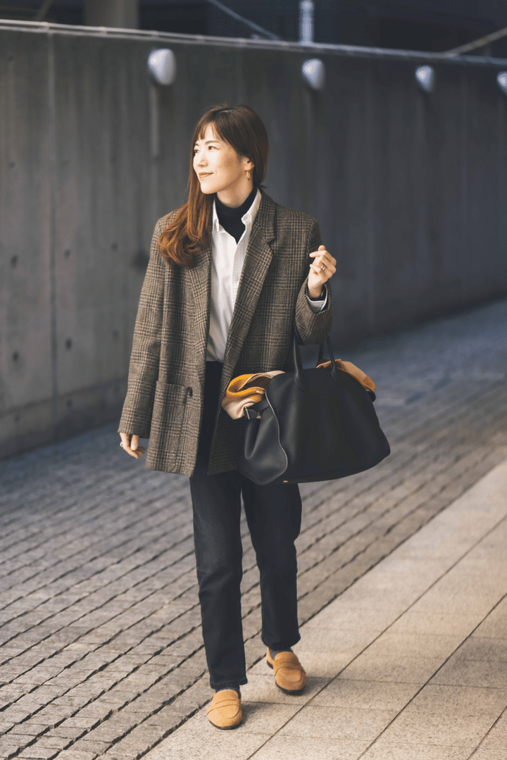 「ジャケットやローファーなどトラッドアイテムが気分で購入したmasscobのジャケットは今年っぽいオーバーデザインが気に入っています。タイトなボトムに合わせてもきちっとしすぎず、こなれた印象に。今日はトラッドな雰囲気にまとめましたが、カジュアルなコーデも楽しみたいです」梅本弓夏さん・37歳(4歳と1歳の男の子ママ)