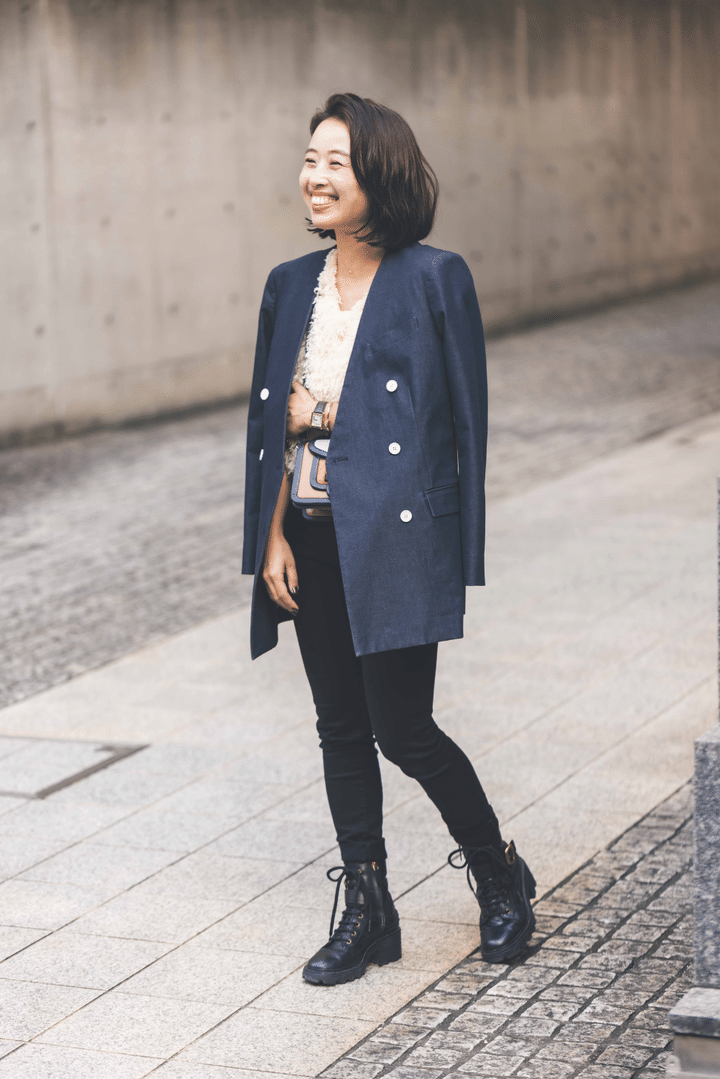 「スウェーデンのインフルエンサー、マチルダのブランドのオーバーサイズジャケットを購入。身長168cmと高身長なので、国内のものだとぴったりサイズになりがちですが、肩の落ち方や袖の長さがちょうどよく気に入っています。子どもといるとパンツ合わせが多くなりますが、今季はミニスカートと合わせたコーデにも挑戦したいなと思っています」石原真裕子さん・32歳(1歳の男の子のママ)