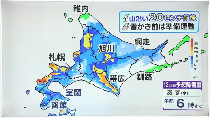12日夜に降る雪の量です。広く5センチ前後ですが、黄色やオレンジの道北や後志、日高地方の山沿いで20センチ前後です。重たい雪なので雪かき前の準備運動も忘れずに行いましょう。
