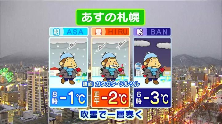 12日夜はプラスの気温で、湿った雪や雨が降り、路面はグチャグチャになりますが、あす13日は冷たい北風に変わり、寒くなります。濡れた路面がツルツルに凍りそうです。