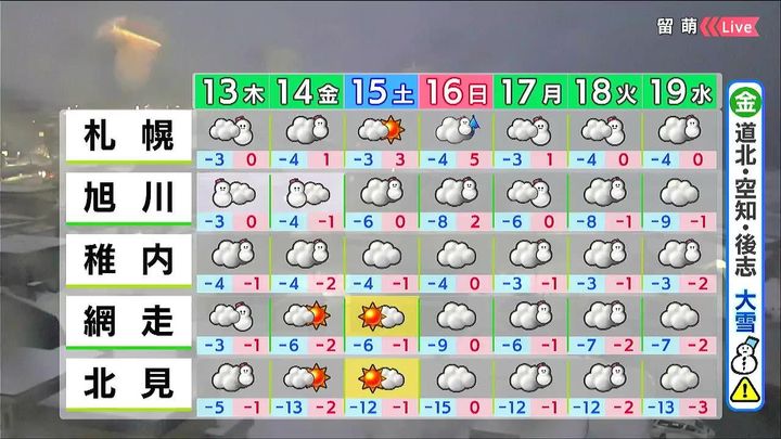 金曜は雪雲が発達し、上川や留萌、空知、後志を中心に大雪になるおそれがあります。土日は気温が上がり、落雪事故などに注意が必要です。