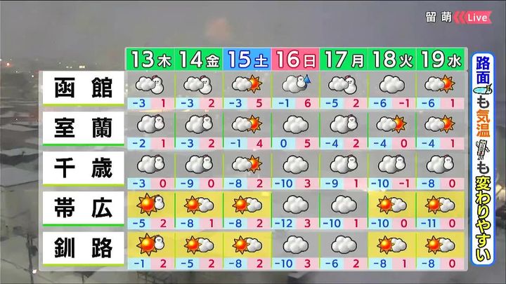 金曜日も西部で雪が降り、函館では降り方が強まりそうです。土曜日は晴れて寒さが緩み、気温は3月並みです。路面状況の変化に注意して下さい。