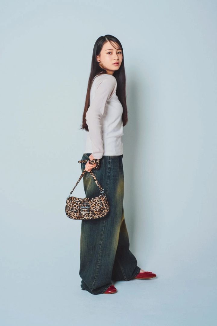 ヒョウ柄バッグ 3,299円/WEGO リンガーTシャツ 1,990円/UNIQLO デニムパンツ 7,920円/イプゴ(blaseout)イヤリング 3,630円/ミミサンジュウサン(サンポークリエイト)フラットシューズ 6,600円/オリエンタルトラフィック(ダブルエー)