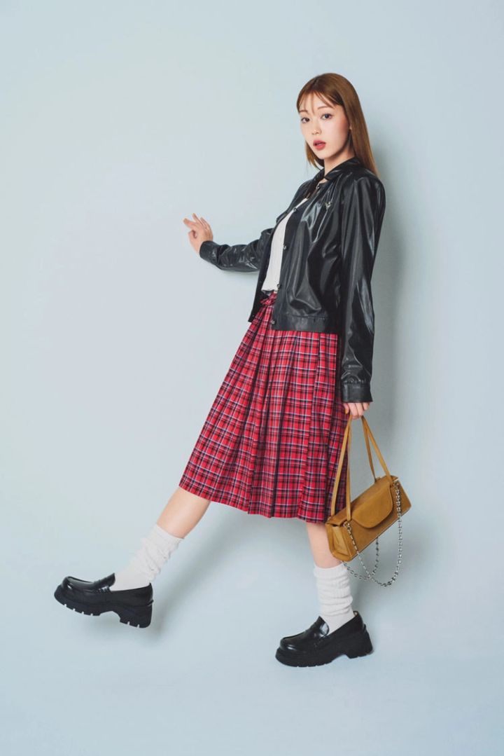 赤チェックミディアムスカート 16,500円/クランク(HANA)ジャケット 39,160円/ベネシー(blaseout)白タンクトップ 3,990円/Gap バッグ 11,990円、ローファー 15,180円/ともにMOUSSY(バロックジャパンリミテッド)ルーズソックス 1,540円/靴下屋(Tabio)