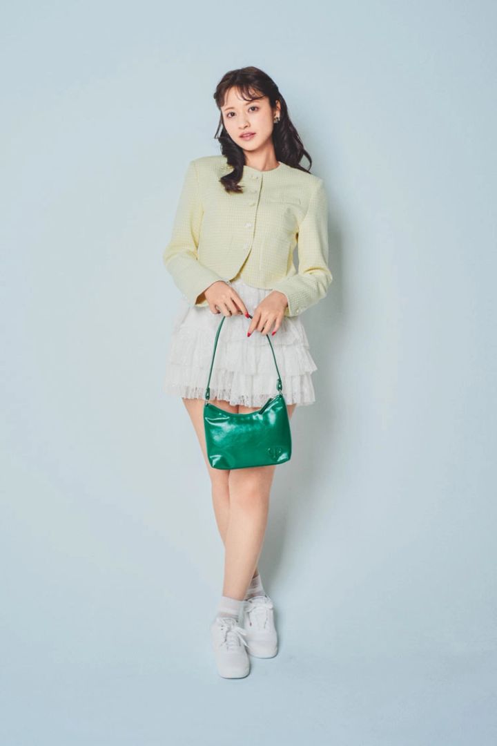 イエローギンガムチェックジャケット 24,000円/seooocookie レースフリルミニスカート 9,790円/dazzlin イヤリング 2,530円/アネモネ(サンポークリエイト)バッグ 19,970円/クリスティーンプロジェクト(HANA)ソックス 660円/靴下屋(Tabio)スニーカー 8,250円/Reebok