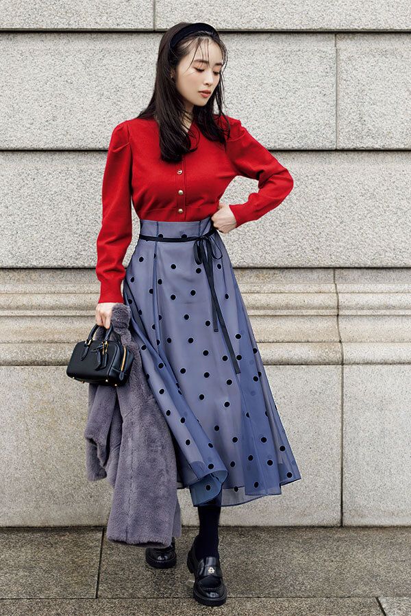 ルージュなカーデ×水玉フレアでフレンチシックな装いに