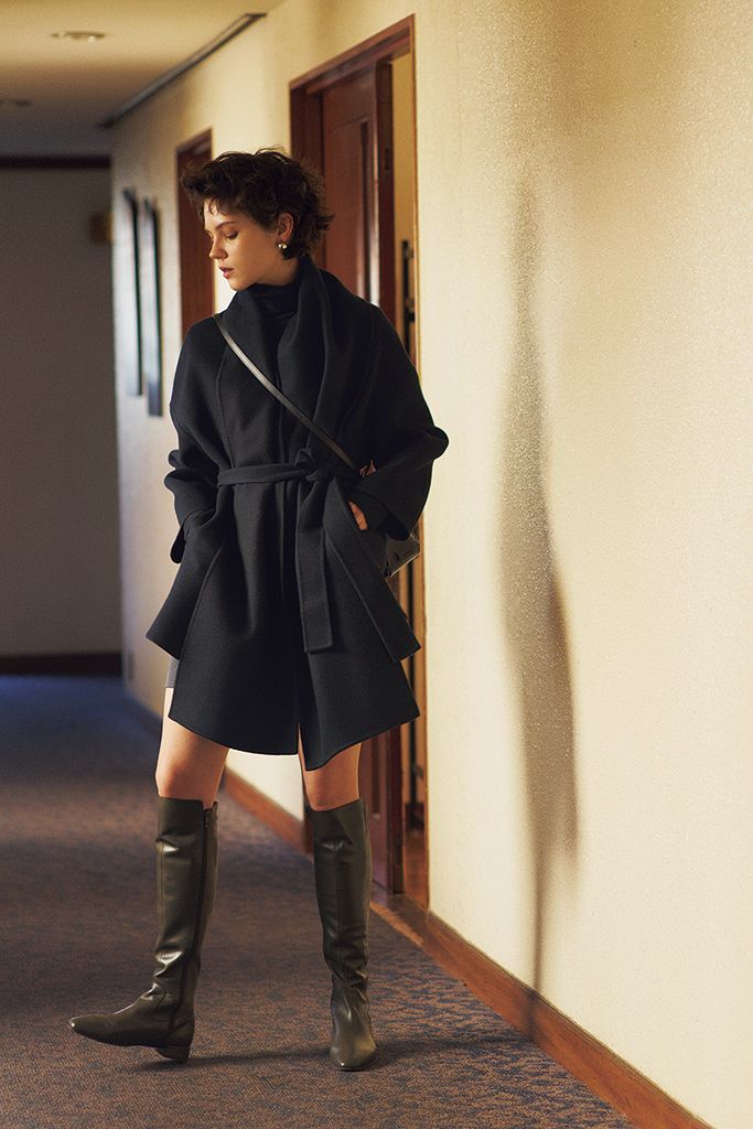 付属アイテムのストールやベルトによる立体感でシルエットに変化球。ヒップの隠れるミディ丈なら、前をしっかりおおってミニワンピ風に着ることも。足元にインパクトを足せるロングブーツでさらに完成度アップ。 黒コートは着まわし。グレーショートパンツ/アルアバイル ロングブーツ/ダイアナ(ダイアナ 銀座本店)