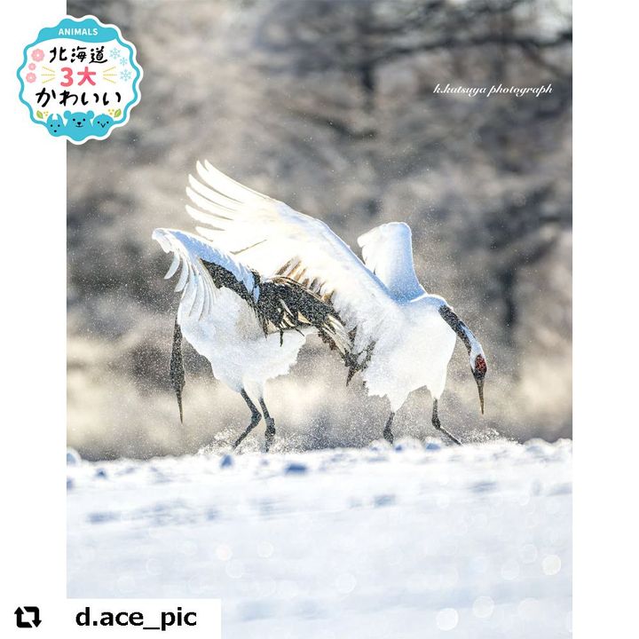 タンチョウのペアが〝求愛のダンス〟を舞って、そのいちばん最後に、お互いに〝おじぎ〟をするのですが、その瞬間のお写真なのでしょう。冷え込んだ朝だったのでしょうか、激しいダンスによって巻き上げられた〝雪煙〟のような雪の粒が、美しい結晶のように、2羽を包み込んでいて、とっても良い雰囲気になっていらっしゃいますねー。