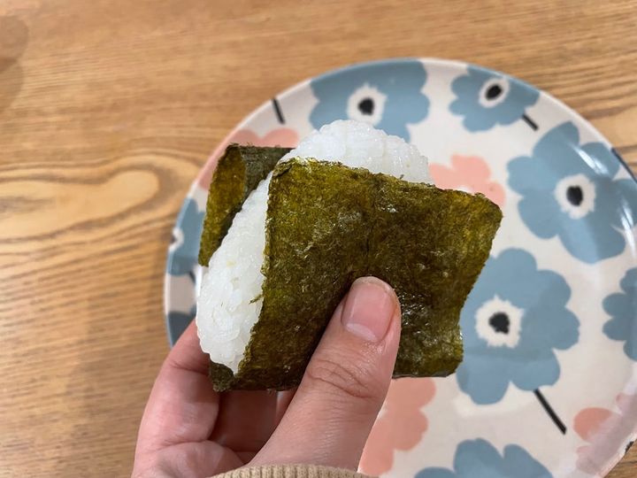 いつものように白米で握ったおにぎりに、先ほど穴をあけたのりを巻いて食べてみました。