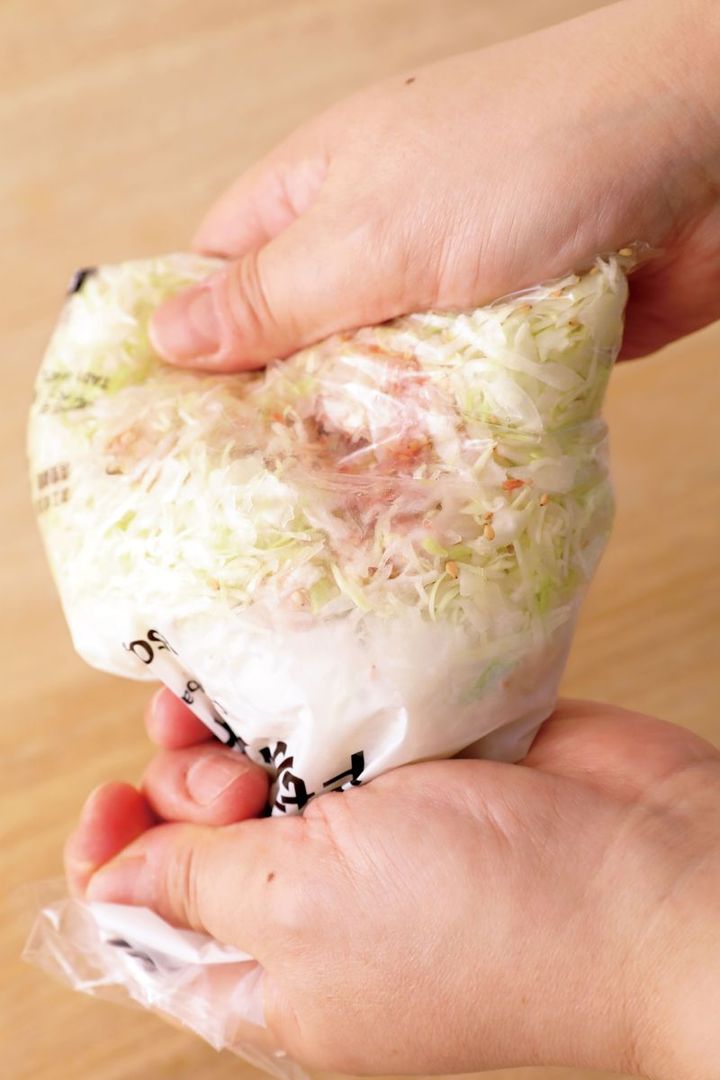 キャベツは袋の口を開けて、塩昆布を加える。キャベツがしんなりするまでもみ、水けをきる。