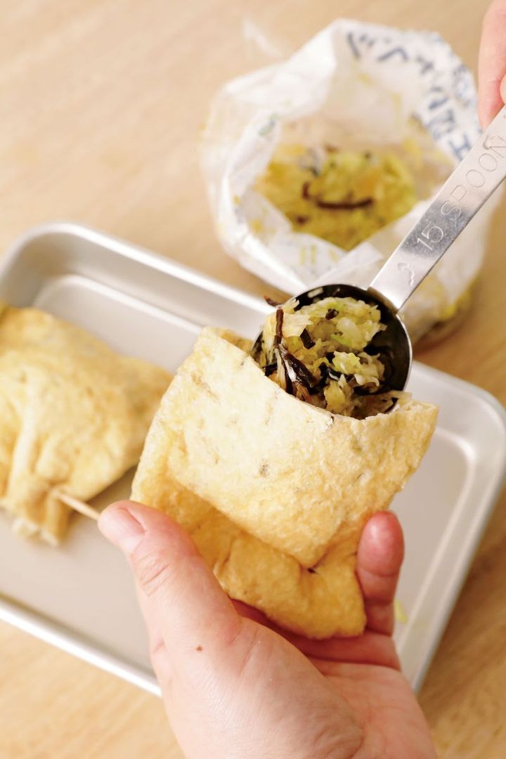 油揚げは横半分に切り、切り口を開いて袋状にする。(2)を1/2量ずつ詰めて、つま楊枝で口を縫うように留める。オーブントースターの天板にのせ、薄く焼き色がつくまで5~6分焼く。