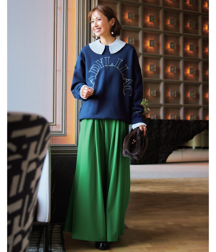 カジュアルさに顔が追いつかず難易度の上がるスウェットは甘めに振るのもアリ。プリーツ衿のブラウスで甘さと品の良さを足しつつ、グリーンパンツがクールに中和。新鮮スタイリングでオシャレの殻を破って。