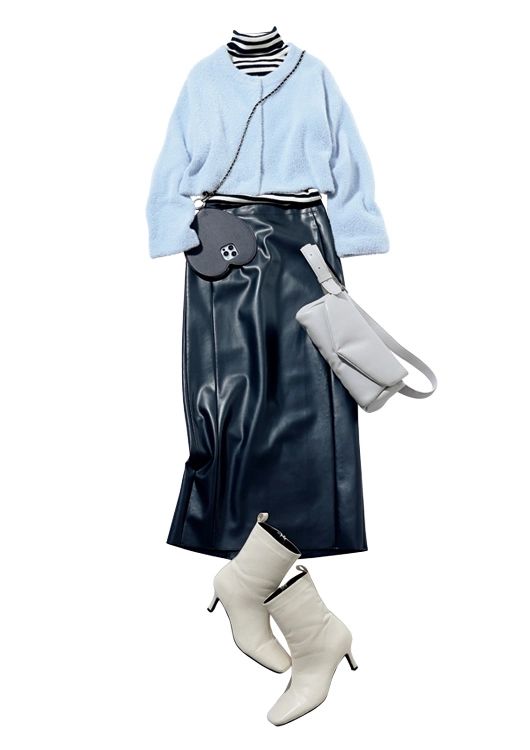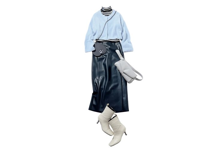 ニットセットアップ(カーデ)¥11,000/e/rm(アダストリア) フェイクレザースカート¥25,300/エリオポール(エリオポール代官山) ボーダータートル¥4,389/ロペピクニック(ジュン) ロール型ショルダーバッグ¥8,800/カカトゥ(アンビリオン) ショートブーツ¥2,420/神戸レタス スマートフォンケース¥12,100/エジュー