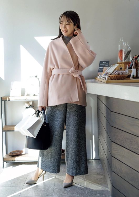 ぱっと一発で絵になるアイテムといえば、今季ならショート丈コート。淡いピンクを選べば、袖を通すたびに心躍ります。パンツやパンプスはエレガントなものを選び、お嬢さん風にキメて。