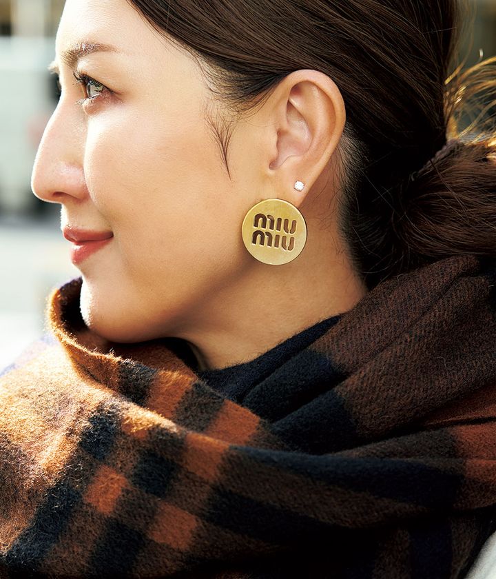 濃いブラウンのマフラーにはゴールドジュエリーが相性◎、シンプルだけどキャッチーなMIU MIUのピアスをチョイス。