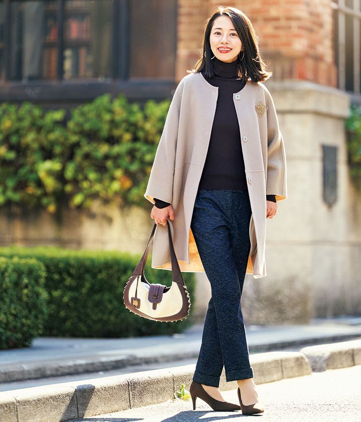 『仕事柄、上品できちんと見えるコーデが基本。黒やネイビーなどのベーシックカラーが中心でしたが、最近は洒落感が高いのに怖く見えないブラウンを着ることが増えています。』