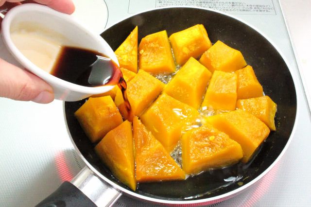 5. 水分が少し残っている状態でしょうゆを加え、かぼちゃをひっくり返してフタをして5分煮ます。