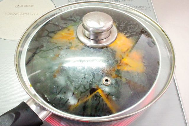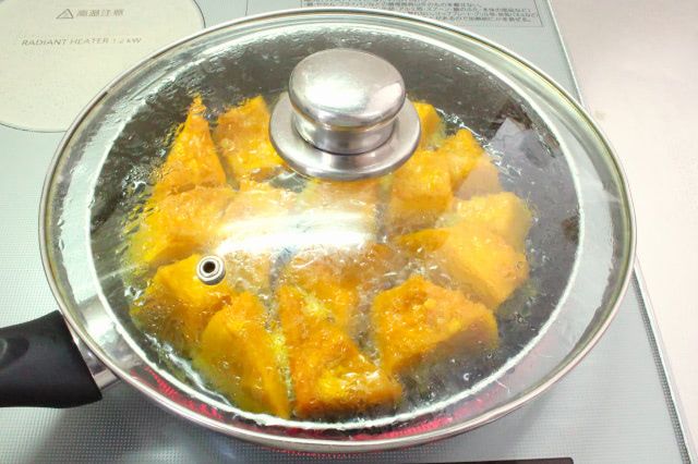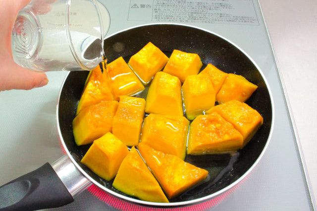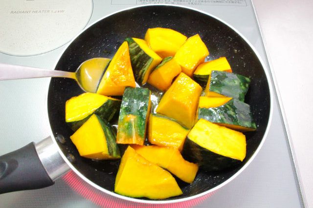溶けてシロップ状になった砂糖をかぼちゃ全体に絡めながら、1分ほど加熱しました。