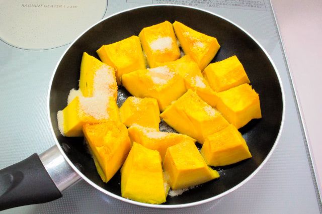 点火前にかぼちゃに砂糖を振りかけるのがポイントです。砂糖の保湿効果でかぼちゃがやわらかくなり、しっとりと仕上がるそうです。砂糖に大さじ1杯の水を加えることで、加熱した時に溶けやすくなりますよ。