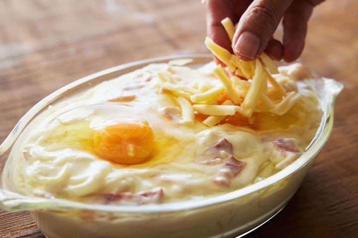 耐熱皿に(2)を入れて卵を割り入れ、チーズをのせる。オーブントースターでチーズがこんがりとするまで10分ほど焼く。粗びき黒こしょう適宜をふる。