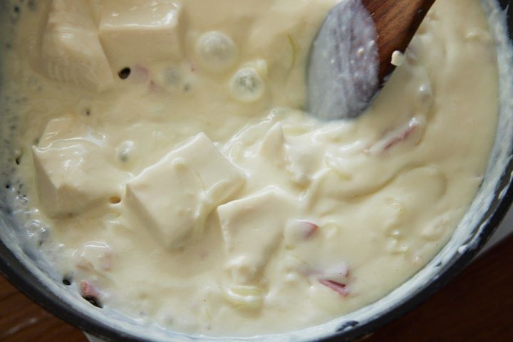 フライパンにバター20ɡを中火で熱し、玉ねぎを入れてしんなりとするまで2 分ほど炒める。弱火にし、小麦粉大さじ3を加えて粉っぽさがなくなるまで炒める。ホワイトソースの材料を加えてよく混ぜ合わせ、豆腐、ベーコンを加える。煮立ったら弱めの中火にし、とろみがつくまで混ぜながら4~5 分煮る。