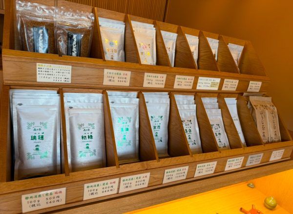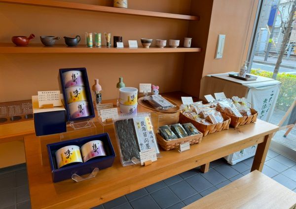 店内に足を踏み入れると、お茶やナチュラルスイーツ、急須や茶器が並び、洗練された雰囲気が広がっています。