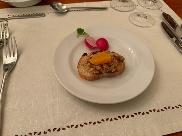 「麹水のハイボール」で乾杯の後、最初の一皿は「オレンジ風味の麹豚リエット」です。こちらをいただいている時に、上柿元シェフ自らご挨拶に回って来られて「手づかみでどうぞ」と仰った通り、豪快にいただきました。