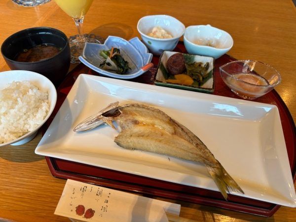 減農薬のお米、玄米麹味噌の味噌汁、ホテルの庭で麹を食べている鶏の朝とれの卵、塩麹のカマス、麹入りのオレンジジュースと身体に良いものをたっぷり取り込める、朝ごはんでした。