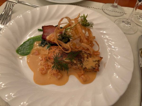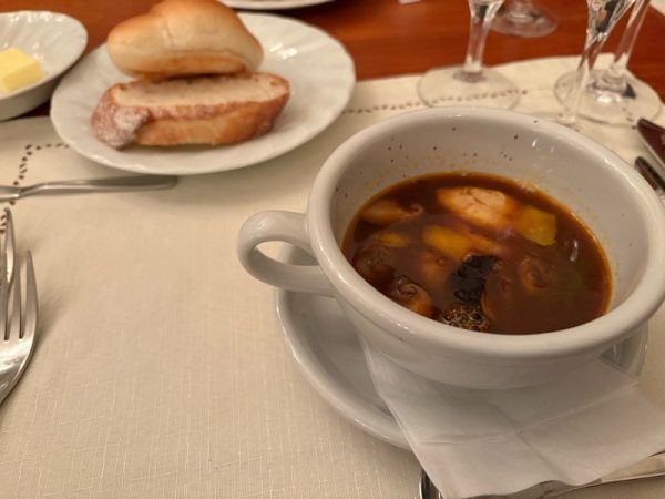 そして「北海道産ホタテ貝 地元産鯛のクネル入りのスープ ゆずの香り」です。香り豊かで、心まで溶かされるようなスープでした。昨年、松元のイベントで、上柿元シェフの限定スープをいただいた時にも、私のイメージするスープとまるで違い感動したことを思い出しました。