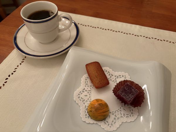 「可愛い小菓子とコーヒー」では、「アプリコットショコラ」「木イチゴのジュレ」「フィナンシェ」をいただきました。「ジュレ」は、今まで食べる機会があまりなかったのですが、ジューシーさに驚きました。