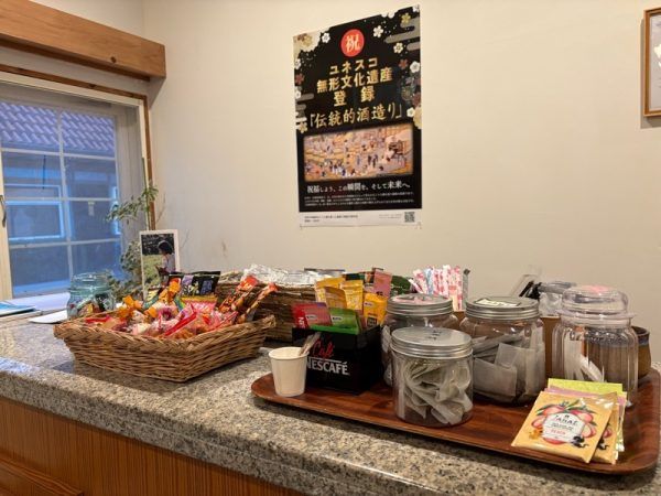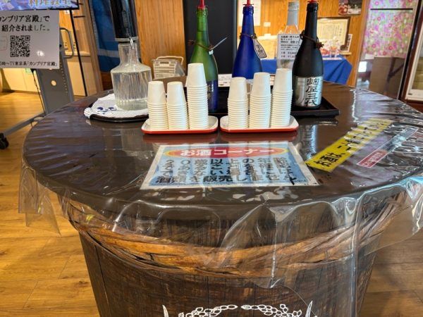 チェックアウト前には、売店に立ち寄りました。焼酎や甘酒の試飲コーナーや、昨日、大浴場で使用した、ヘアケア、スキンケア商品なども並んでいました。ちなみに宿泊者は、お部屋の鍵を持参すると10%オフで購入できるので、買っちゃいました。