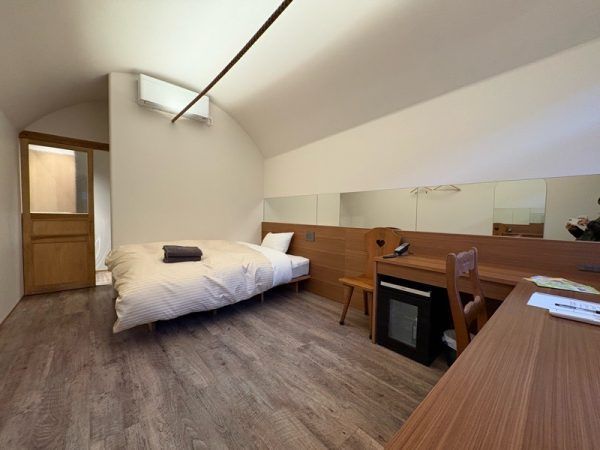 シングルルームですが、室内はとても広々としています。使いやすいL字型のデスクもあり、椅子も木製でおしゃれです。奥には、洗面台、トイレ、シャワールーム完備です。