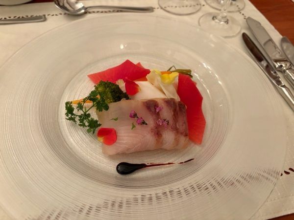 次は「鹿屋産カンパチのフィメ 地元有機野菜のマリネ添え」です。会には霧島市長も参加されていて、地元の美味しいもの一緒に味わっていらっしゃいました。