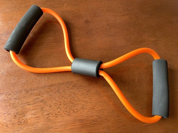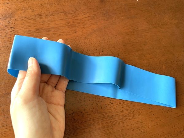 頭の後ろのほうで両手で握って両腕を左右に広げたり、両足首に引っ掛けて片足を広げたり。持ち手などもないシンプルなチューブなので手で持つだけでなく、体のいたるところに引っ掛けてトレーニングができました。
