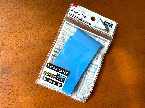 「トレーニングチューブ(ハード)」(110円)もゴムタイプの筋トレグッズ。長さ30.3cm、幅5cmのゴムチューブで、ソフト、ミドル、ハードと3タイプの強度があります。今回はハードタイプにしました。