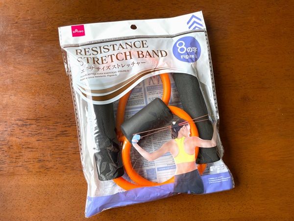 「エクササイズストレッチャー(8の字)」(110円)は、エクササイズや筋トレに便利な8字型チューブです。こちらは8の字タイプですが、真ん中の結び目がないOの字タイプもあります。