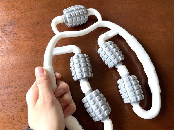 端っこの持ち手を掴んで太ももに挟むと、かなりしっかり挟まります。そのままコロコロと4つのローラーを転がすと気持ちいい! 素足でやると痛気持ちいい程度でしたが、痛みが気になる人は洋服の上からやるのがおすすめ。持ち手が持ちやすく、使いやすいので楽しいです。太ももやふくらはぎの内側と外側を同時にほぐせて時短にもなります。