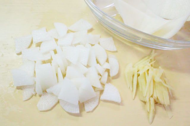 1. 大根の皮を厚めに剥いて厚さ5mmのいちょう切りに、しょうがの皮を剥いて千切りにします。