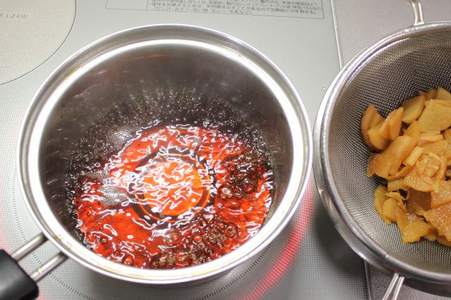 常温で冷ました具を取り出し、煮汁だけを強めの中火で1分ほど加熱して煮立たせました。大根を取り出さずに加熱すると、福神漬け特有のパリパリ食感が出ないそうです。