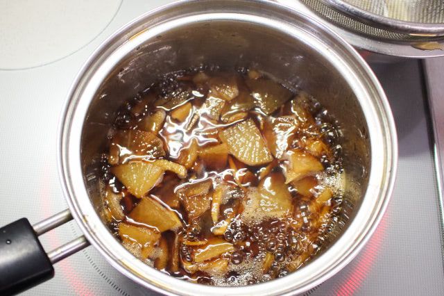 この時点で大根を味見すると、1回目に煮た時よりもしょうゆの味が染み込んでいて、濃いめの味付けになっていました。