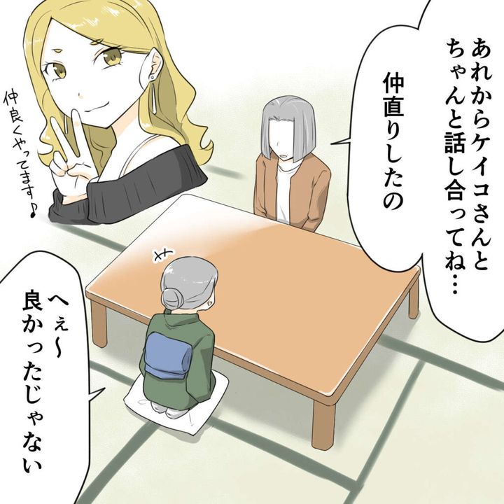 嫁のケイコさんとは折り合いが悪く叱ってばかりだったようですが、ケガの時にはサワコさんのために一生懸命だったケイコさんと仲直りをしたのだそうです。母は「よかったじゃない」と嬉しそうに言いました。