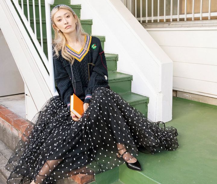 ボリュームたっぷりのチュールスカートで日常着がたちまち華やかに。チルデンニットプルオーバー¥99,000、ドットチュールスカート¥198,000(共にケイタマルヤマ)、カチューシャ、ピアス、シューズはスタイリスト私物