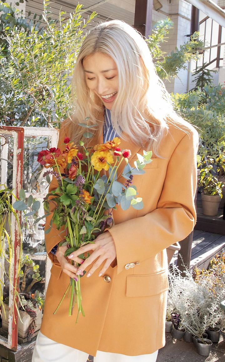 ジャケット×シャツの定番スタイル。今季はカラージャケットで気分転換を。ブレザージャケット¥132,000、マーガレット刺繍シャツ¥69,300、ドラゴン刺繍シルクパンツ¥165,000(全てケイタマルヤマ)