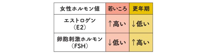 45歳前後で生理にばらつきがあれ ば、更年期に入っていると思ってほぼ間違いありませんが、婦人科の血液検査で女性ホルモンの数値を調べるのもひとつの方法。更年期になると、エストロゲンのなかでも最も体への作用が強いエストラジオール (E2)の値が低くなり、卵胞刺激ホルモン(FSH)の値は高くなります。ただし、ホルモンの値は常に大きく変動し、採血のタイミングによって変わるので、あくまで参考ととらえて。