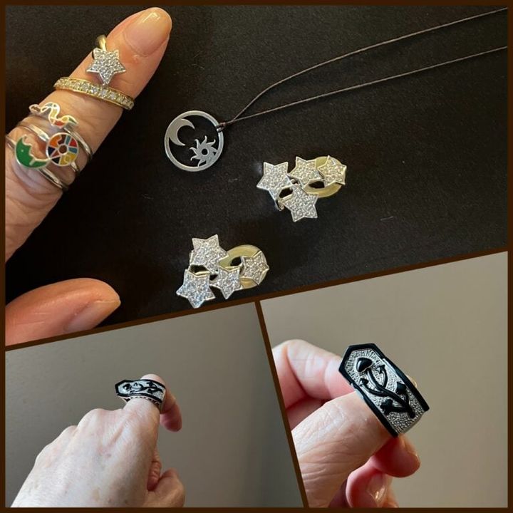 スニーカー:adidas アクセサリーやジュエリーはタロットカードの絵柄にあるモチーフを選びました。