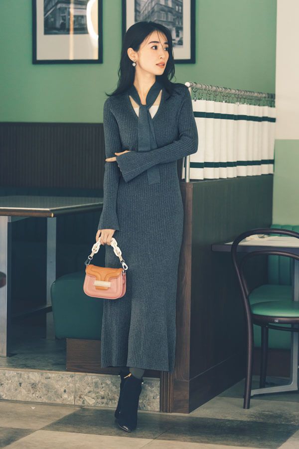 ボウタイデザインやフレアスリーブで感度の高さもアピール。ワンピースがシンプルなぶん、バッグでハズしをきかせて。