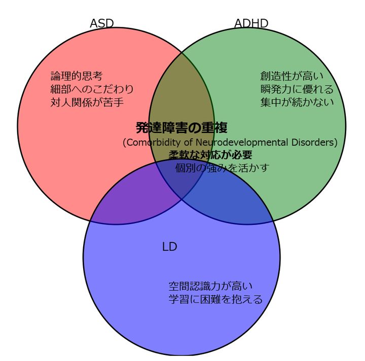 LD(学習障害):ここに当てはまる人は、読み書きや計算が困難な場合があるものの、空間認識力や直感的な問題解決能力に優れるとされる。