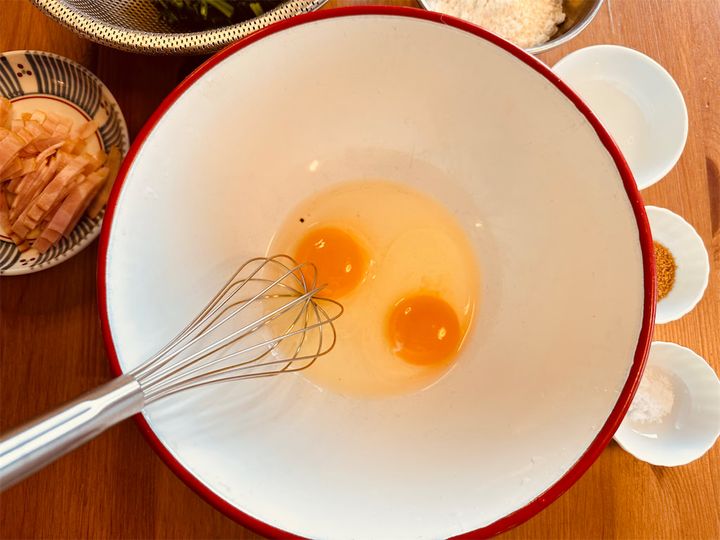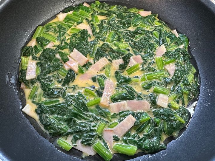 2.ベーコンは5mm幅くらいに切る。ボウルに卵を割りほぐし、[A]を入れてよく混ぜる。ほうれん草、ベーコンを入れ、よく混ぜる。