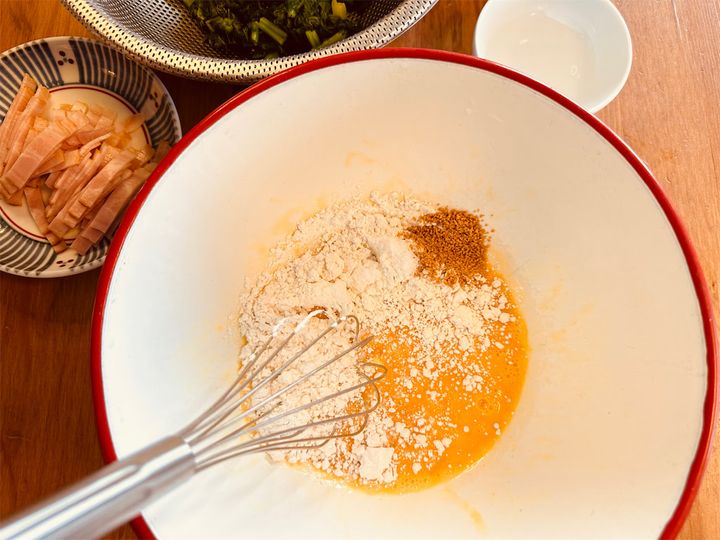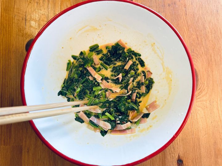 ほうれん草、ベーコンを入れ、よく混ぜたら生地の準備は完了!